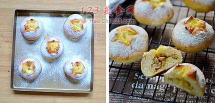 7、烤箱190度预热,放在第二层(图片放错了,哈哈,2分钟后发现,已经换回来了,记得,上面顺数第二层),用烤网上下火烤15分钟至表面金黄即可取出,放烤网上放至微温时放入保鲜袋保存即可(吃完后只剩下两个,哈哈)。