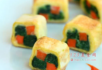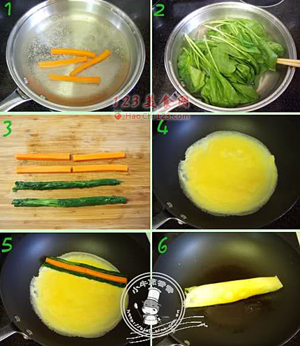 5、等蛋液稍稍凝固时,将胡萝卜条、菠菜条组合成“田”子形,放入蛋液的一边。