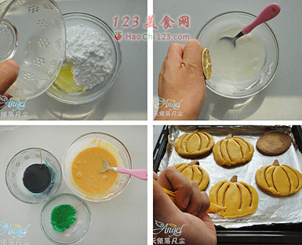 14、蛋白糖霜装入顶端剪了小口的裱花袋,在饼干上挤上需要的颜色。