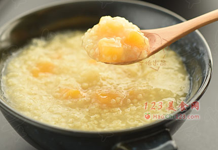2、如果用普通锅熬,就把水煮开后放入小米和红薯,熬30分钟以上,时间太短的话,熬出小米粥有硬心,不好喝。