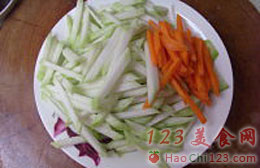 一、材料准备:将蒲子和胡萝卜切成丝。