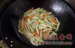 2、翻炒胡萝卜丝和蒲子丝。