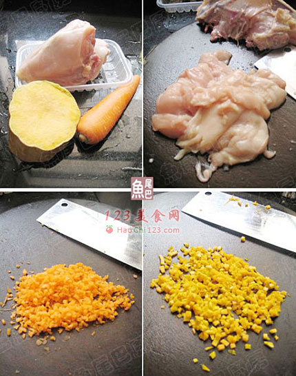 3、南瓜和红萝卜一定要切得碎碎的,否则会影响蒸出来的成品效果。