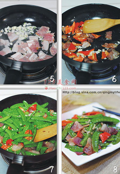 7、8、再加入沥干水分的荷兰豆,快炒约2分钟左右后调入适量盐和鸡精翻炒均匀即可。
