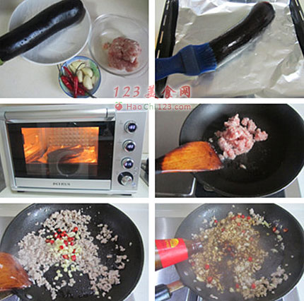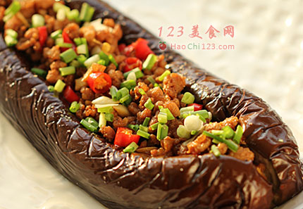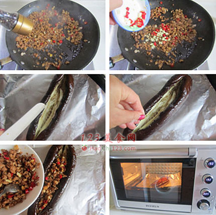 3、最后将它们组合,先放入盐给茄子入点底味,再放入刚煸炒过的肉末,一起放入烤箱中继续烤上五分钟,烤好后拿出,在表面撒点小葱末即可。[sushi.laoyanhuo.com]