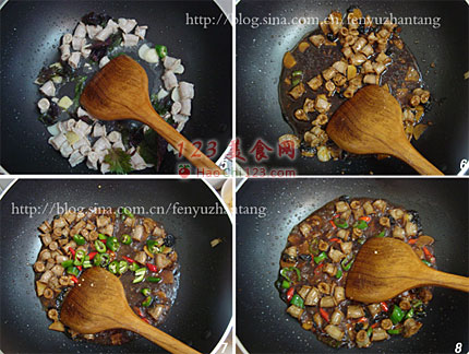 7、水煮到快收干时放入青红椒。