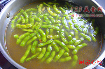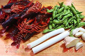 6、毛豆清洗干净后,剪去二端。用煮龙虾的水,再煮毛豆5分钟。捞出装盘。此汤水可以食用的。