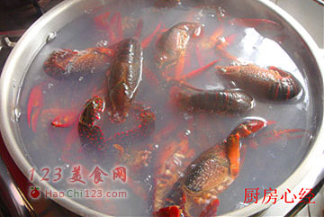 3、小龙虾水开后放入锅中焯水,大约1分钟后捞出。
