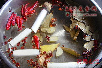 4、另起锅,注入清水,放入干辣椒、香叶、八角、花椒、葱姜,煮开后,小火熬煮10分钟料水。