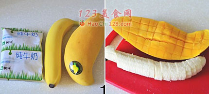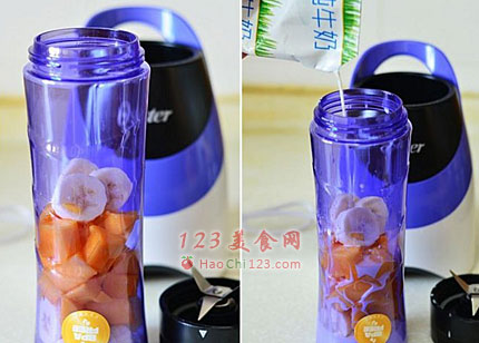 2、把香蕉块和芒果块放进Oster奥士达随身搅拌器的杯子里,再倒进牛奶。