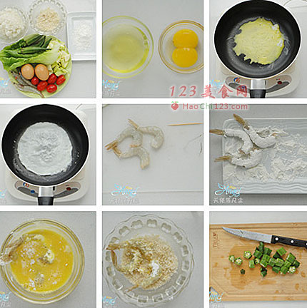10、不粘锅放油加热,将虾两面煎至金黄。