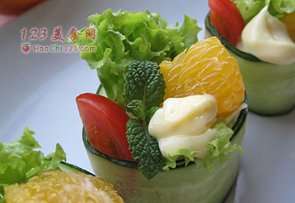 5、将甜橙果肉、生菜、小西红柿、球生菜混合,淋上柠檬汁装入黄瓜盅内。