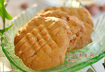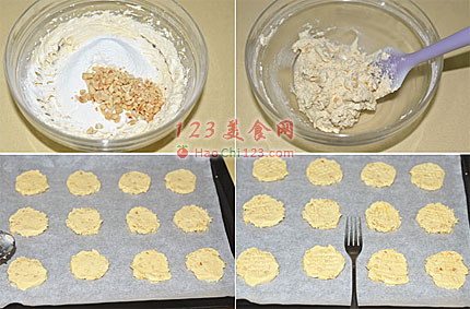 2、酥饼里加花生粒是为了增加口感,也可以省去,用叉子压花纹的时候会轻松。