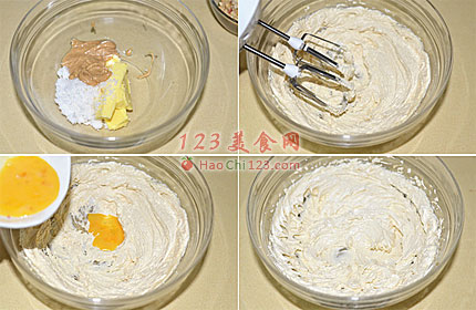 3、鸡蛋打散,少量多次的加入到黄油中,每次加入都要保证搅打吸收均匀。