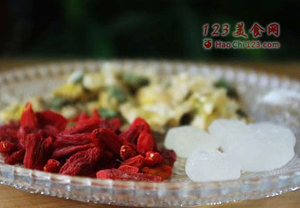 2、锅内放清水适量,放菊花、枸杞和冰糖一起煮开,十分钟后即可饮用。