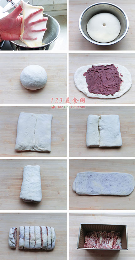 4、将面团擀开成长方形,将豆沙放入中间对折包起。将面团三折一次,松弛15分钟。