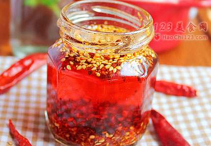 10、浇入热油,此时油温已基本降至2、3成热了,辣椒油不会翻滚冒泡,此为三炸红。待辣椒油晾凉后即可装瓶,保存一周后食用风味更佳。