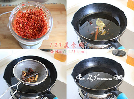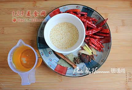 2、花生油放入锅内,低油温放入香料,炸出香味。