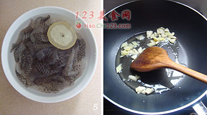 6、锅里下油,爆香蒜瓣和姜片。
