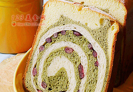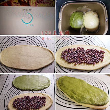 9、原味面团铺上蜜渍红豆粒,在将另一片抹茶椭圆面片覆盖在红豆粒上。