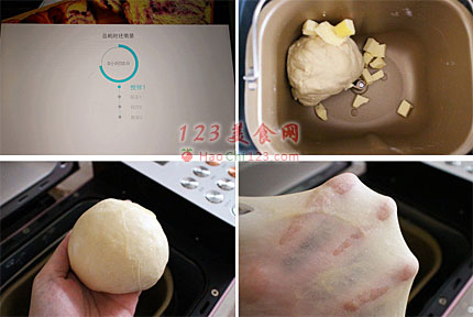 4、面包机开始自动第二次揉面,完成的面团表面光滑,可撑出薄膜。此为原味面团。