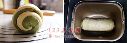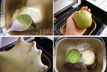 5、取一半的原味面团,放回入面包机桶中,撒入抹茶粉,面包机继续第三次揉面(另一半原味面团用塑料袋包起防止表面干裂)。