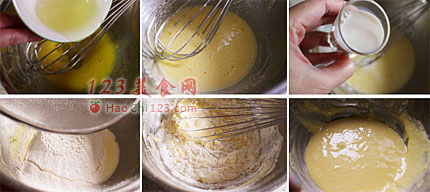 14、色拉油分3次加入至蛋黄糊中,每一次加入都要充分搅打均匀,蛋黄糊会呈现淡鹅黄色。