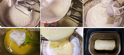 19、将蛋黄糊倒入蛋白霜中,再用刮刀以捞起方式混合均匀,不要画圈搅拌!以免消泡。