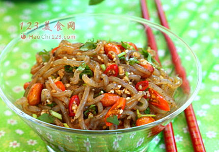 5、将魔芋丝放入大碗中,加入熟花生米、芫荽碎,淋上调味料拌匀即可。