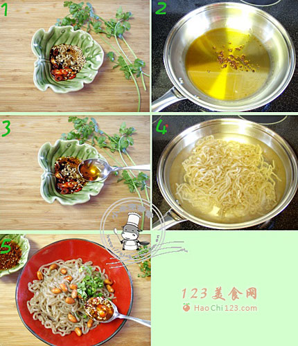 3、剔出花椒不要,将花椒油淋在1料里成为调味料。