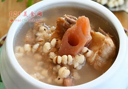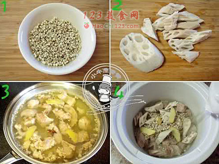 4、将姜片、薏米仁、莲藕、排骨放入慢炖锅,一次加入盖过所有材料的水,煲3小时以上,出锅前加适量盐调味即可。