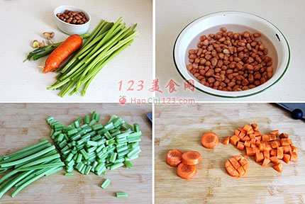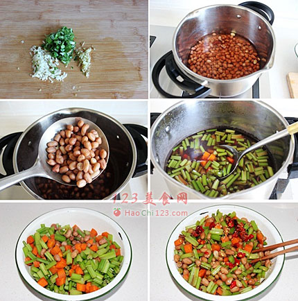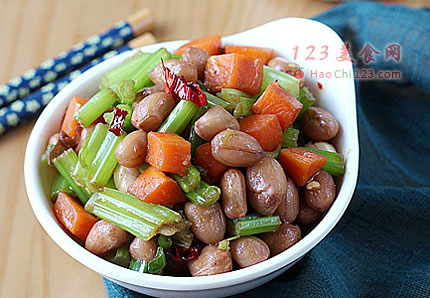 2、煮好的花生米和热水焯烫过的芹菜胡萝卜都不用过凉水,趁热放调料更入味。