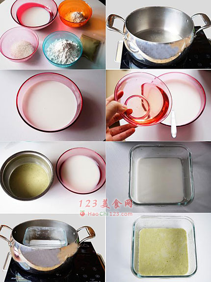 8、再倒入同量的抹茶色的面糊,再上锅蒸凝固。依次类推蒸够九层。
