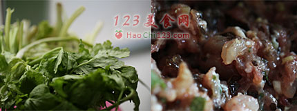 3、肉末加葱姜碎、黄酒、盐和少量清水,顺一个方向搅拌好后,汇入芹菜盆中。