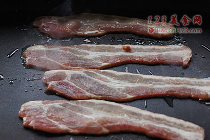 3、加热平底锅和油,大火煎培根至焦脆。