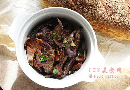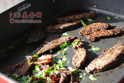 1、煎好的洋葱,甜甜的,跟香脆的培根和羊肝很般配。