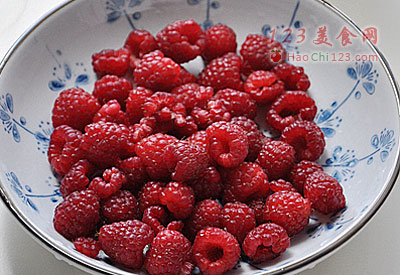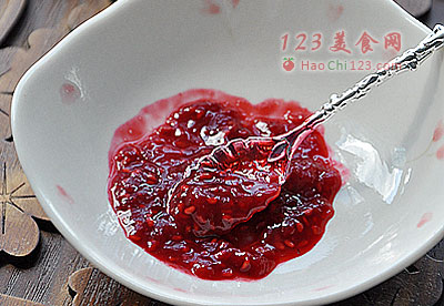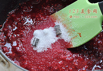 3、用刮刀将树莓捣碎,加入适量香草糖,拌匀后静置1小时。再用小火熬煮至粘稠的果酱状态即可。