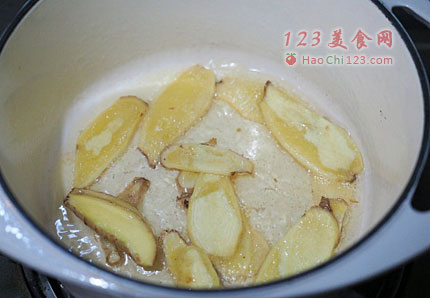 2、鸭肉块表皮部分用厨房纸吸干水份,当姜片煸出香味,拨至一旁,将鸭肉块皮朝下放进锅中煎,将鸭皮中的油份煎出,直到鸭皮变成金黄色。