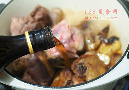 3、倒入小磨香麻油一直翻炒。翻炒均匀,倒入花雕酒,没过鸭肉为宜。