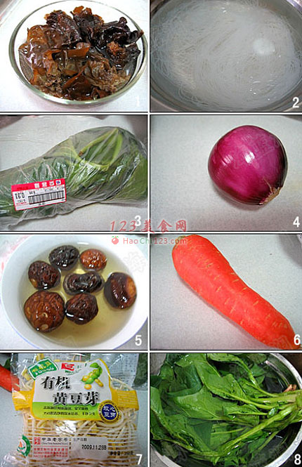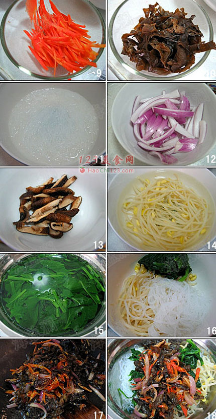 4、16图,把焯熟的豆芽和菠菜还有粉丝装入大碗中。
