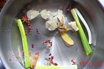 4、先煮一锅料水,放入葱姜、花椒、八角、香叶,水开后,煮2-5分钟。