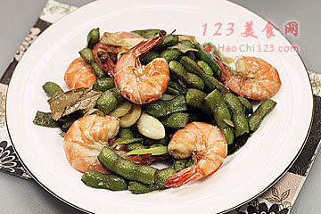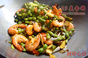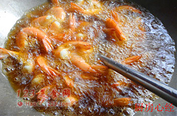 8、然后倒入炸好的草虾,快速烹入碗汁,快速炒匀。翻炒均匀,即可出锅。