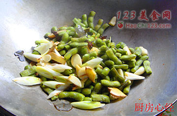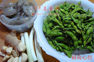 7、锅中放油,爆香大量葱姜蒜。随后放入煮熟的毛豆,翻炒均匀。