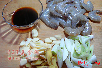 2、草虾去头,避免炸制时虾头弄脏油。大量的葱姜蒜片备用。提前调制好一个碗汁:盐、料酒、酱油即可。