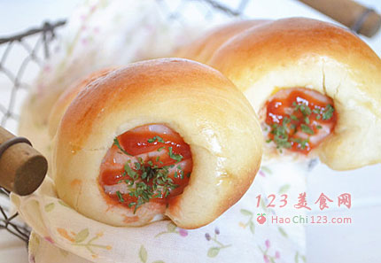 5、出路稍微放凉后,用刷子将蕃茄酱均匀刷在面包内孔,随个人喜好放入相应的馅料,再入烤箱140度烘烤10-15分钟左右,使芝士融化即可。