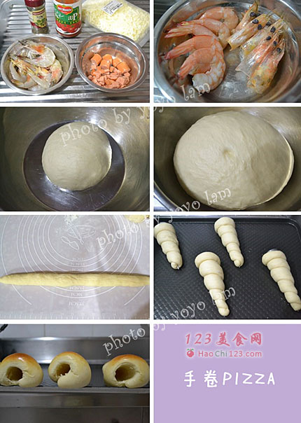 2、将4个面团分别搓成约50CM的长条型,用三能锥形羊角模由下往上卷好。