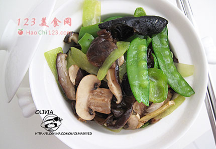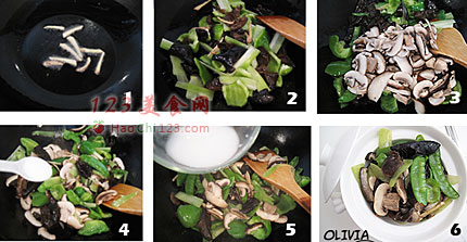3、把提前焯过水的香菇、口蘑和荷兰豆放入锅中中火翻炒。