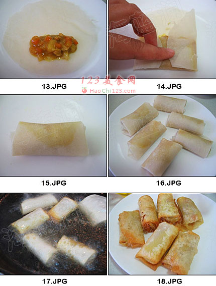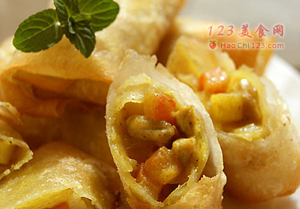 8、这道脆皮咖喱卷是用薄饼卷着煮好的咖喱肉丁,再用油略炸制成。外皮很是酥脆,里面的材料也是浓汁嫩香,吃了一块又一块。[sushi.laoyanhuo.com]