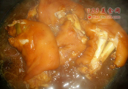 3、放猪手入锅,然后放入所有的辅料,大火烧开,转小火焖一个半小时即可。