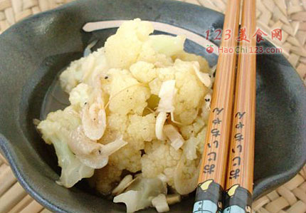 5、放上一点水(水一定要少,锅内有汤就可以,因为菜花已经是熟的了)翻炒一下。